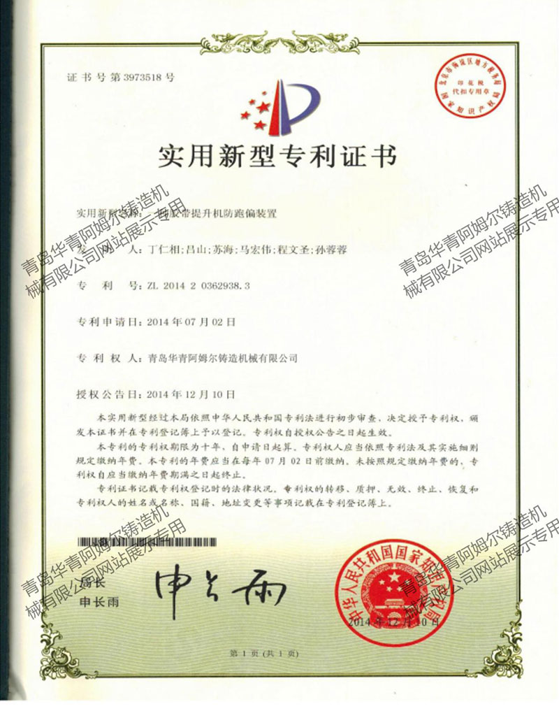 > 胶带提升机防跑偏装置专利证书 >